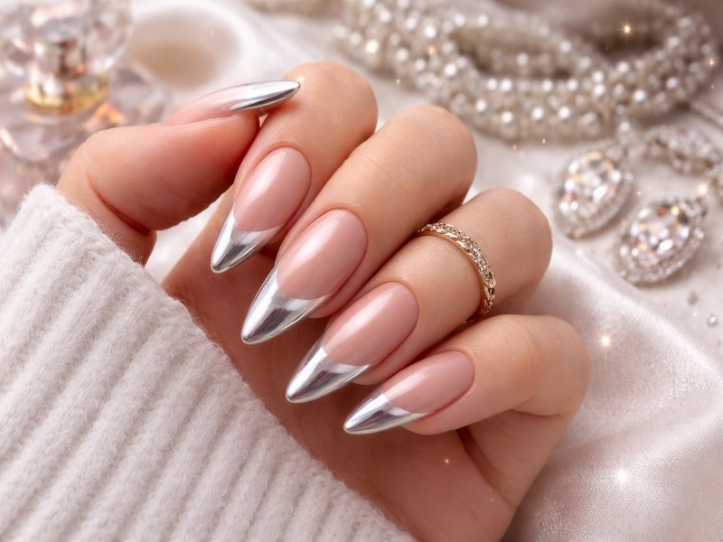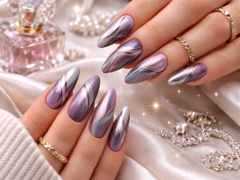 Chrome Nails are known for their mirror-like, metallic finish. Cat Eye & Chrome Nails use a magnetic gel that creates a captivating, shifting line effect, resembling a cat’s eye. Both styles offer a sleek, futuristic look that’s perfect for 2026.
