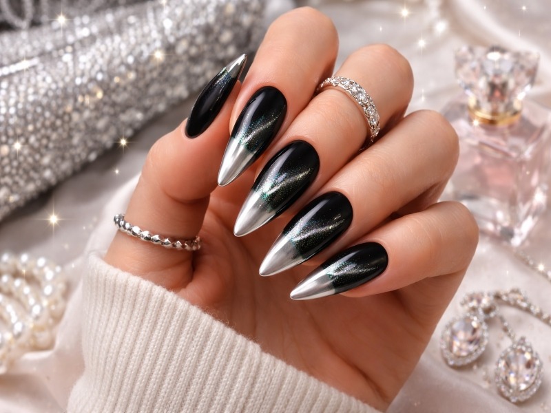 For Cat Eye & Chrome Nails who love contrast, this design uses bold black polish as the base, accented by silver chrome at the tips. The cat-eye effect on black nails is intense and captivating, making it the ideal choice for anyone looking to make a statement.