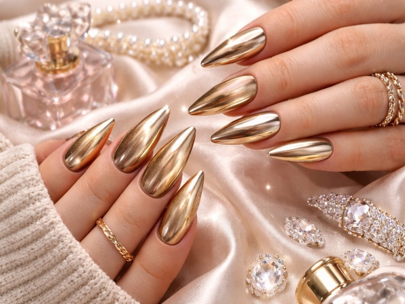 If you’re looking for ultimate luxury, this design uses gold Cat Eye & Chrome Nails with a Mirror Chrome Finish. The result is a striking, ultra-glamorous effect that combines rich gold tones with a flawless, mirror-like finish.