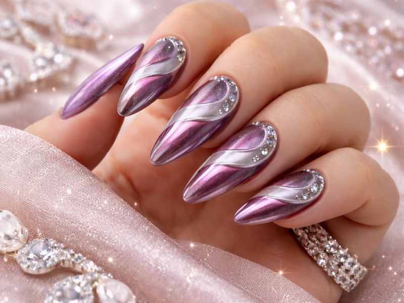 For something truly glamorous, Chrome Cat Eye Swirls with Rhinestones takes the best of both worlds. The cat-eye effect is enhanced with swirling lines that move across the nail, while rhinestones add a touch of sparkle and luxury.