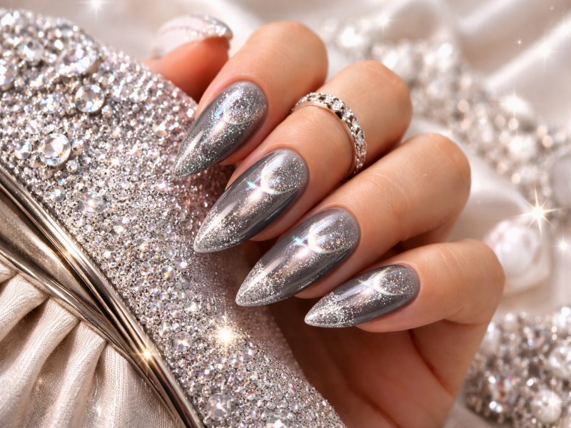 For a more subtle yet glamorous look, the Cat Eye & Chrome Nails with Glitter Fade design is a perfect choice. The nails begin with a chrome base that gradually transitions into sparkling glitter towards the tips.