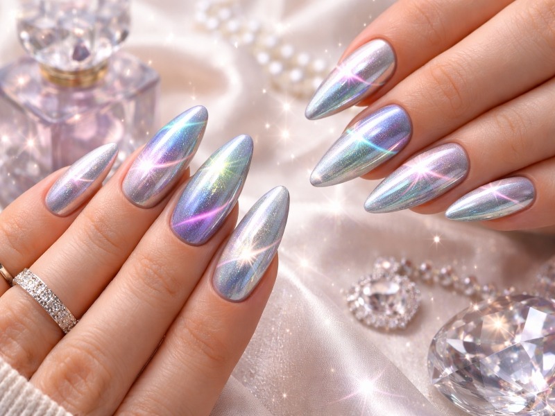 This design takes Chrome Nails to a whole new level by adding holographic elements. The nails shimmer with a variety of colors depending on the light, and the cat-eye effect adds a mesmerizing focal point to each nail.